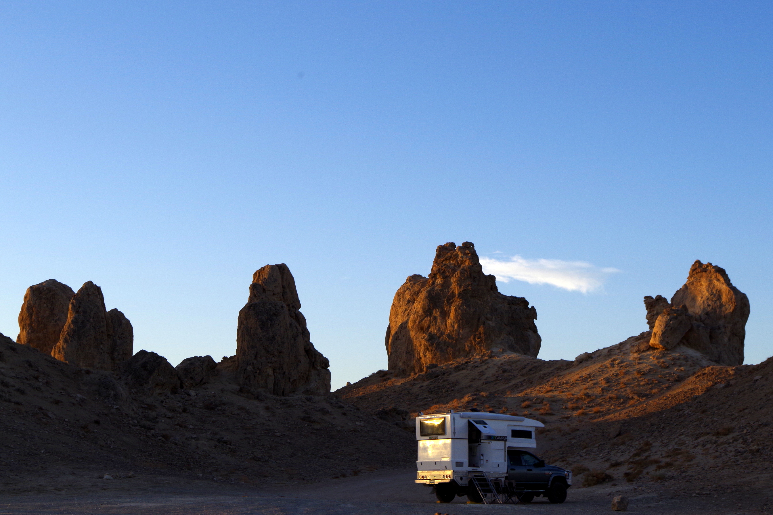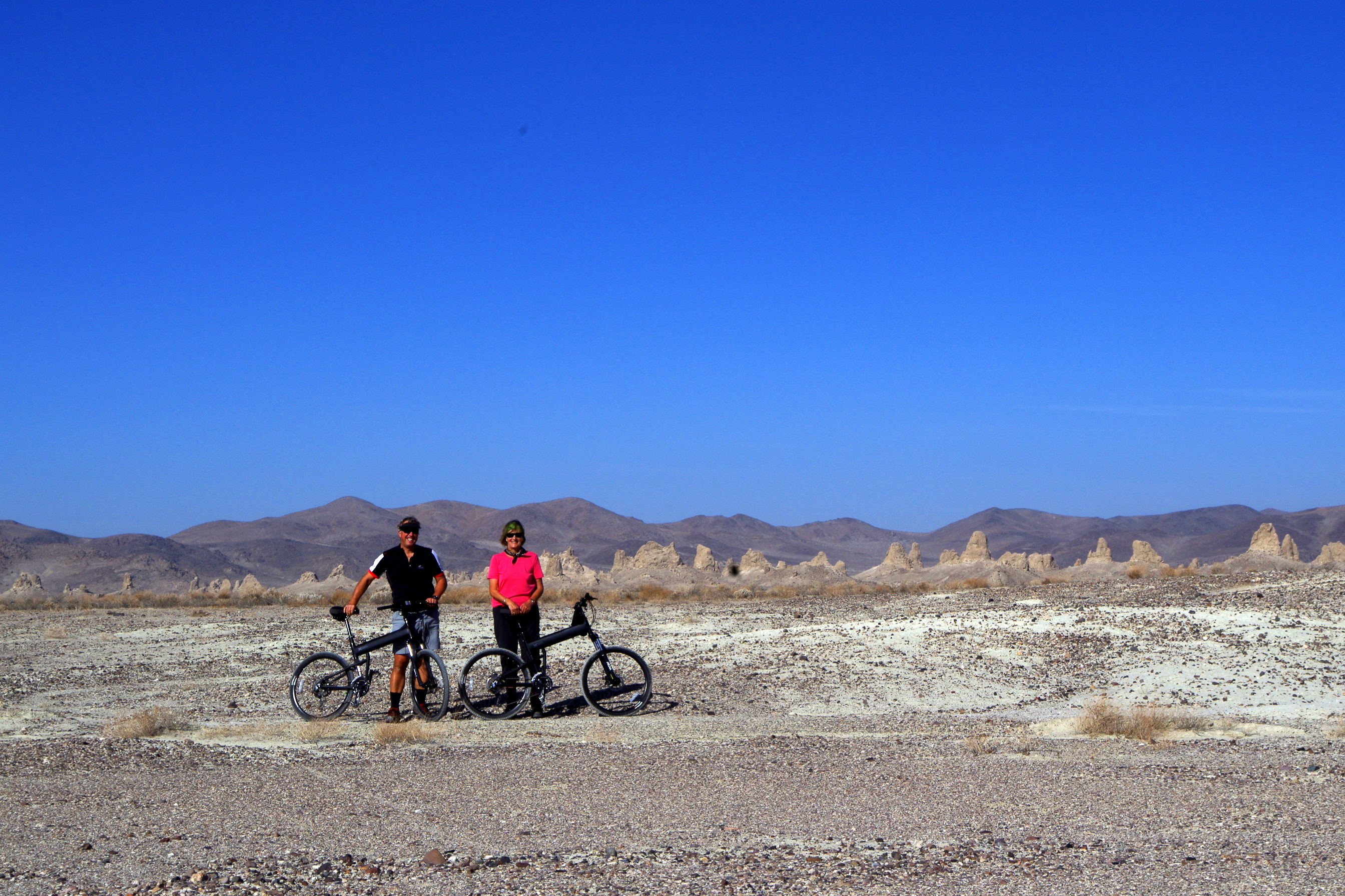 Am Rand der Mojavewüste – zwischen den “Trona Pinnacles“ – fanden wir ein Plätzchen und blieben gleich ein paar Tage. Mit den Rädern erkundeten wir die Gegend in der Türme in allen Variationen und bis zu 50 Meter hoch verstreut sind. Hier wurden Szenen für “Planet der Affen” „ET“ und “Startrek V” gedreht, eine unwirtliche und zugleich faszinierende Gegend. Wir sind alleine, sehen nur hi und da am Horizont ein Auto, oder besser gesagt, Staubwolken die von 4x4s aufwirbelt werden.