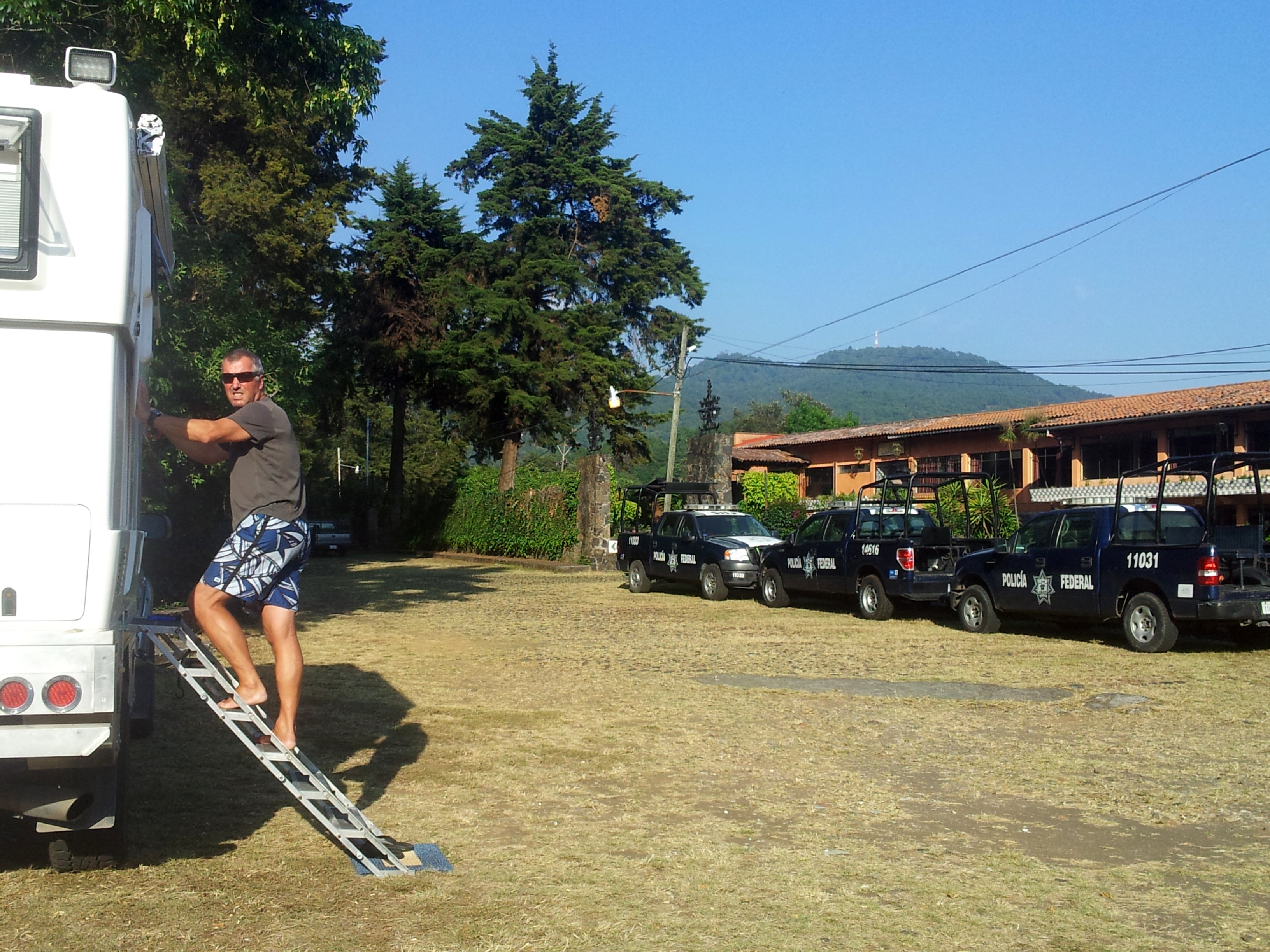 We came to Uruapan and parked in the parking lot of hotel “Pie de la Sierra”, it was full of police trucks and we felt save.