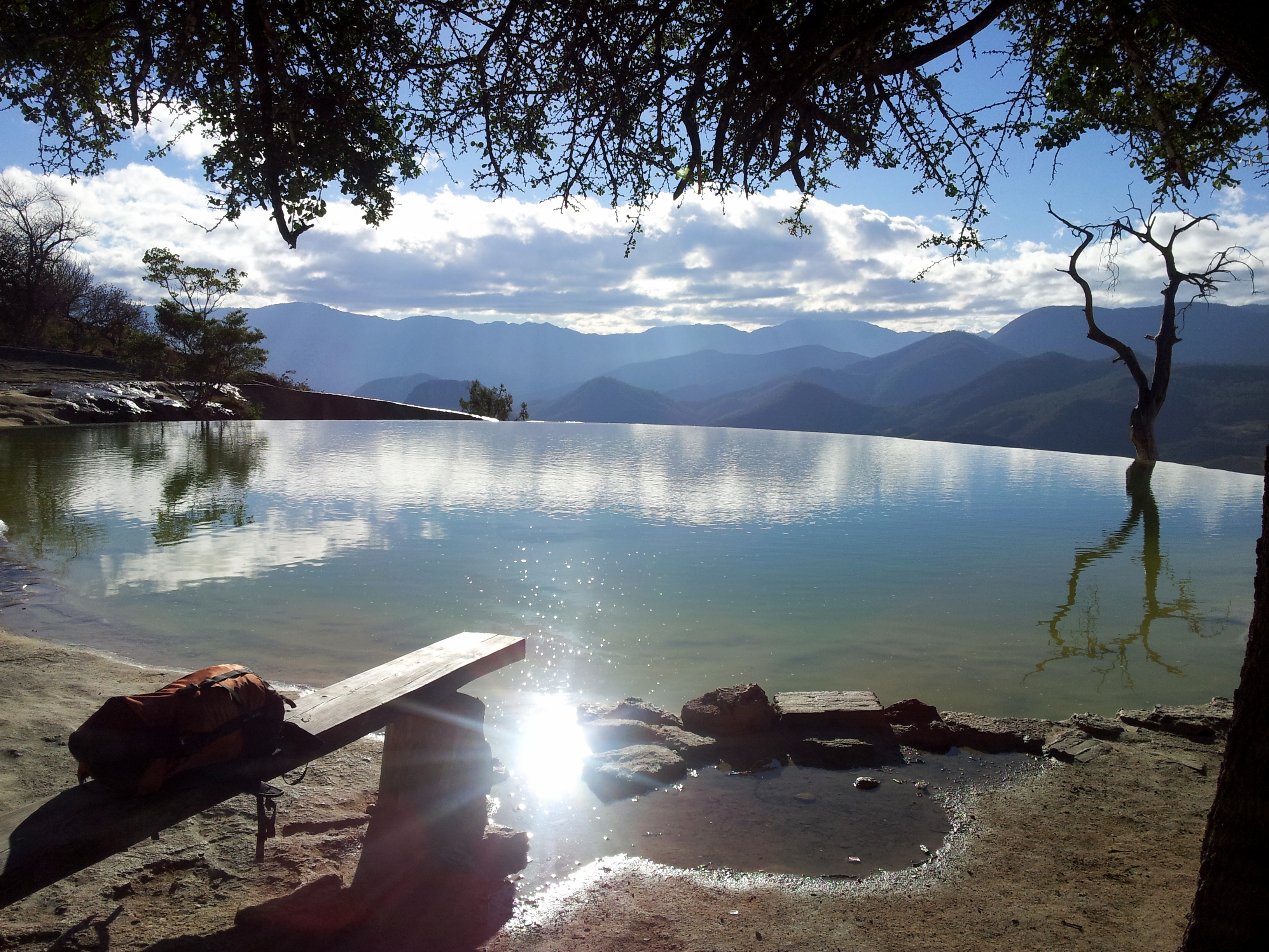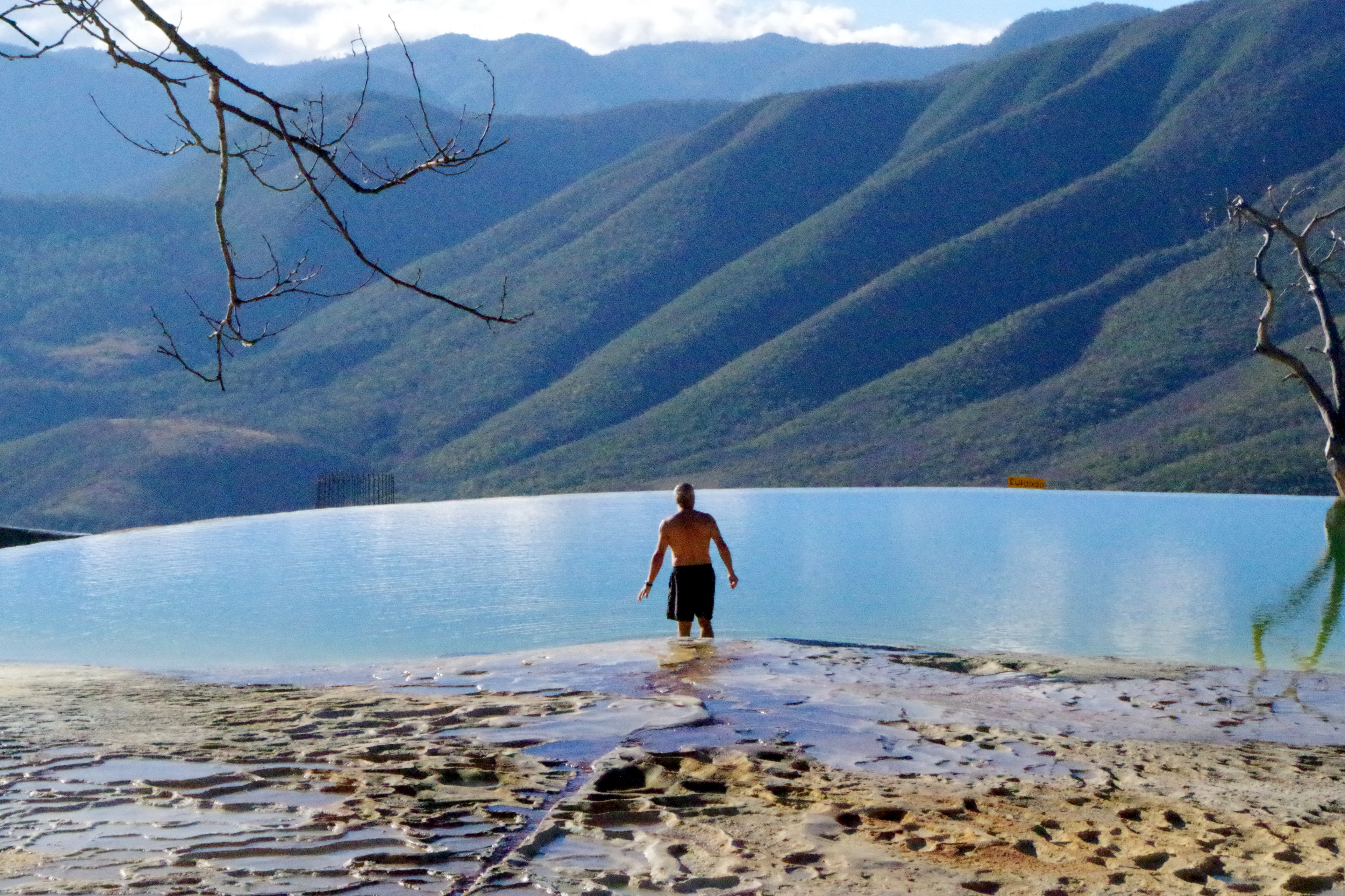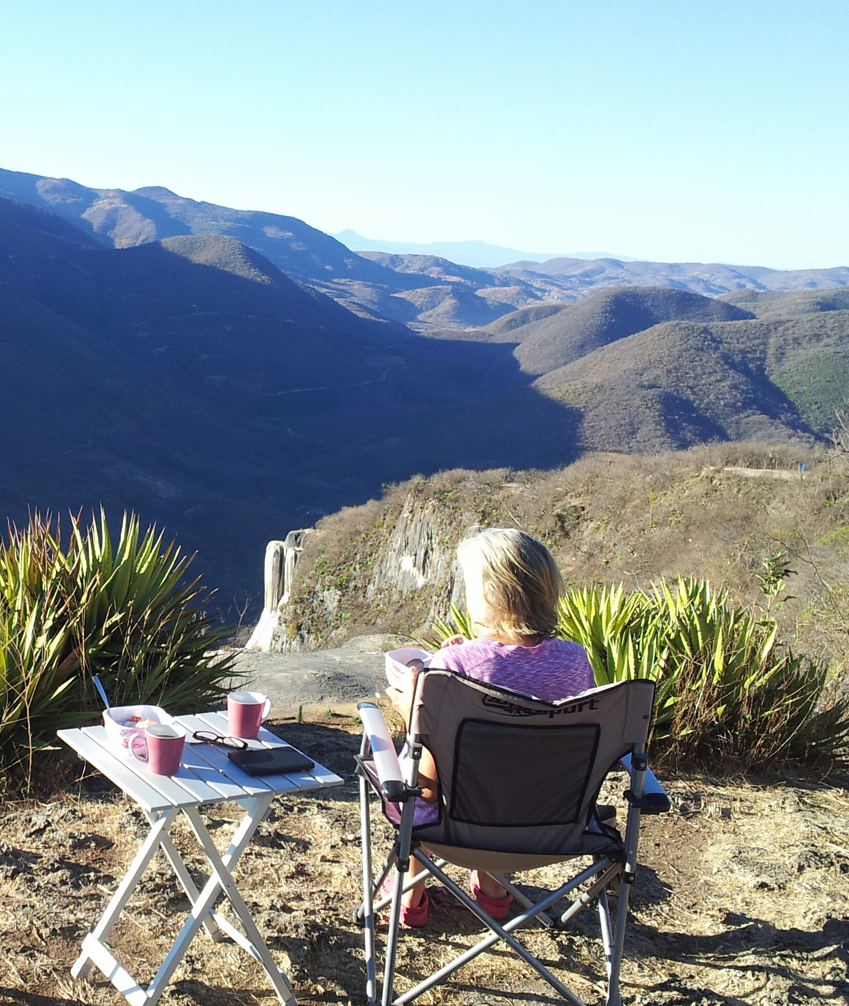 The road to Hierve de Agua is a good graded dirt road and leads over a pass down the other side to a remote valley. Basically, there are several springs that carry mineral rich water and over the years, the constant running water has turned into what looks like petrified waterfalls. There are some pools on top of some of them where you can go for a swim or just sit relax. The air was fresh and cool, the views were beautiful and we woke up to birdsong in the morning. So we stayed for a few days, went for short hikes and swam in the pools. In the valley across you could see the corn and agave fields, people moving about on foot or donkeys. I loved it there.