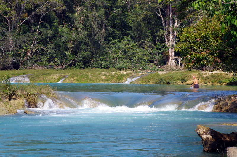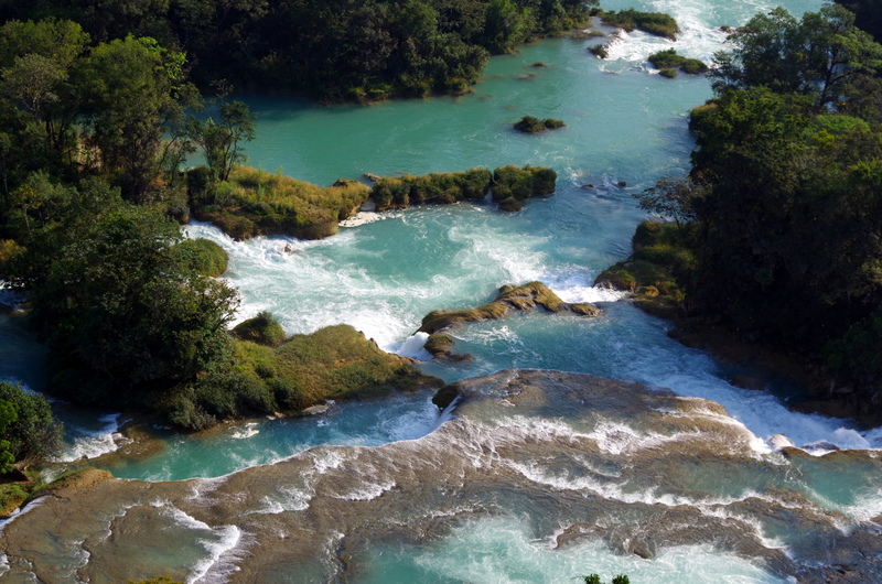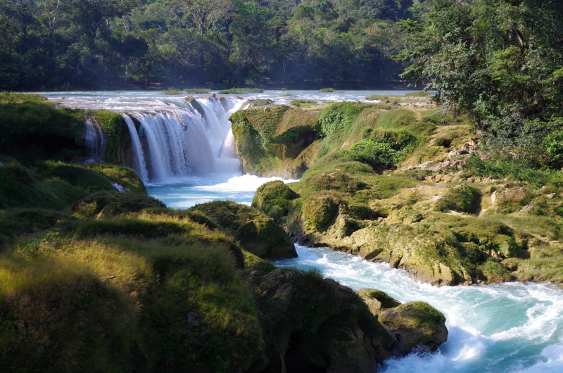 A large area of Chiapas consist of jungle, the Lacandon Rainforest, and hidden in the jungle are many ruins, some excavated, some not yet touched or found. Most people have heard of the famous Maya ruins like Chichen Itza, Palenque or Tulum. We decided to drive along the border to Guatemala and visit the lesser known ruins of Yaxchilan and Bonampak. On the way there are great rivers, many lakes and waterfalls. So we took our time, hiked up waterfalls, swam in crystal clear lakes and rivers coming from the jungle.