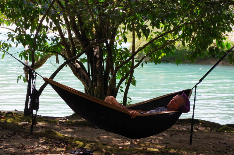 San Cristobal is situated in the highlands and as we slowly descended down it got warmer every day. We packed up our down blanket and brought out the “Endless Breeze” fan. Most of the time it is too hot to go for walks during the day, early mornings are perfect, after that we try to move as little as possible, stay in the shade and cool off in the river or lake. Food spoils rapidly and the bugs turn you into food. I don’t like to start the stove and know now why all the homes have outdoor kitchens. Luckily children come by around lunchtime and sell freshly made empanadas or tamales, for a few pesos you can have a delicious lunch and the children are happy. With the last pound of whole wheat flour a made a loaf of bread in the Cobb grill and grilled veggies to go with the delicous ham we bought in San Cristobal at a Jamoneria.