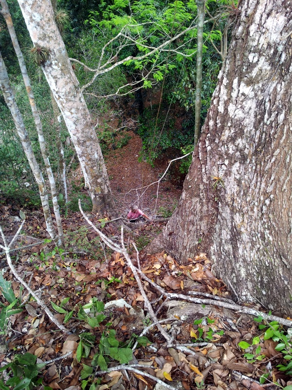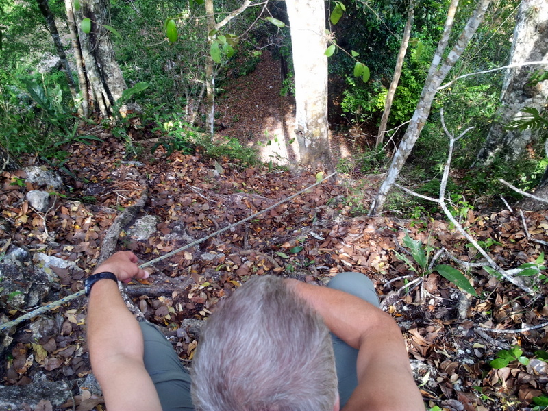 There was a crew of 13 people from National Geographic at a camp not far from us, they were there for a month to film the wildlife. The first night we were told that had seen a jaguar in the camp, well we didn’t see it, that would have been too good to be true. We hiked the 5 km to the archeological site the next morning and it really was amazing after having seen all the restored and rebuilt pyramids in Mexico . It gives you an idea how much work is behind excavating such a place. We climbed one 40 m high pyramid with the help of a rope, it was very steep because the walls had eroded away. Standing on top and looking across the jungle we wondered how much more was hidden out there. Several of the smaller temples had holes from grave robbers, some very old. I guess that profession has been around for a while.