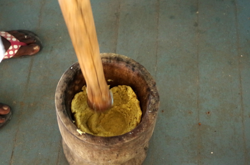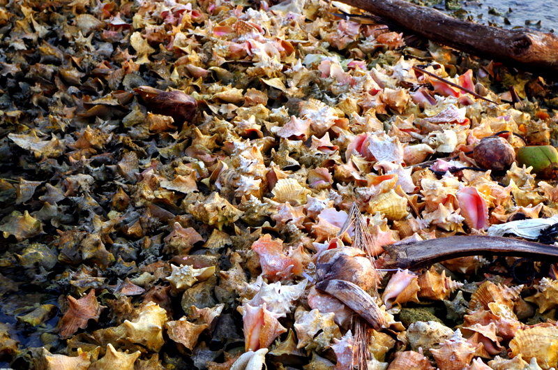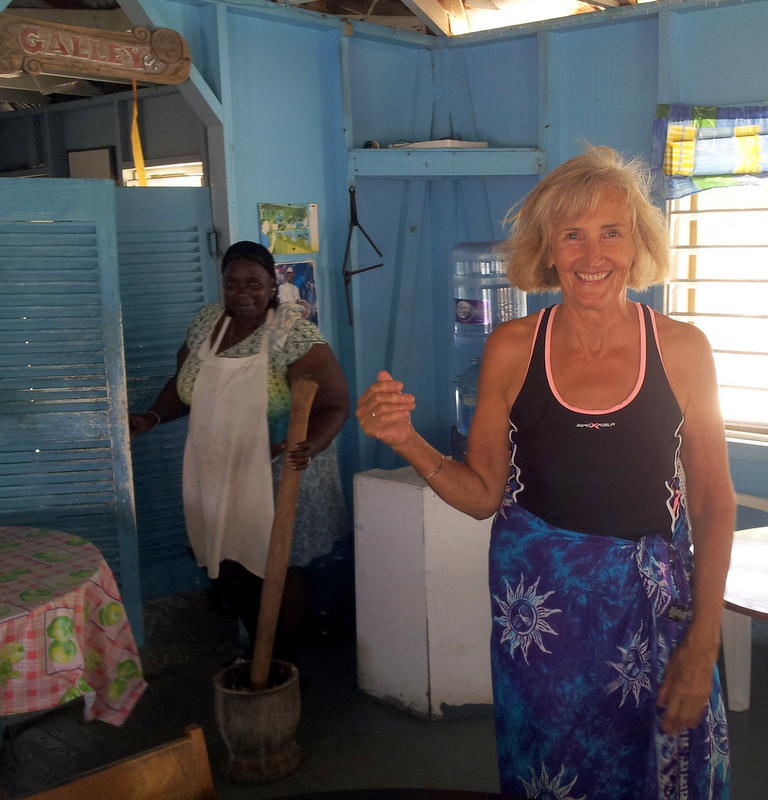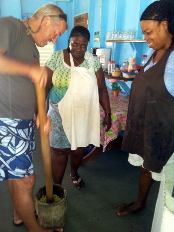 Tobacco Caye is a tiny island (240 x 125 meters) located 16 km out at the coral reefs, it has 18 year round inhabitants, fishermen. There are a few cabanas for rent and there is not much to do there except snorkel, read and snorkel. We had been there 10 years ago and went back to the same place, the Tobacco Caye Lodge. There are two Garifuna ladies, Judi and Anna, that cook for you, three times a day they ring the triangle, you can hear it anywhere on the island, and you march to the cook house and get fed. We had a lots of fun with the ladies and asked for Garifuna food. That was interesting and very good. They shred the cassava and sing their Garifuna rhythmic a capella work songs, they pound plantains to make Fufu, they shred coconut and make a liquid they add to the pounded plantains , chop the conch……The result is a tasty conch soup with Hudutu. We also had Bundiga: Banana, grated and cooked in coconut milk, seasoned with local herbs and served with fresh snapper, and we even had a Garifuna hot cakes breakfast.