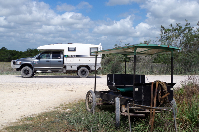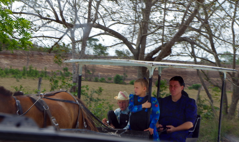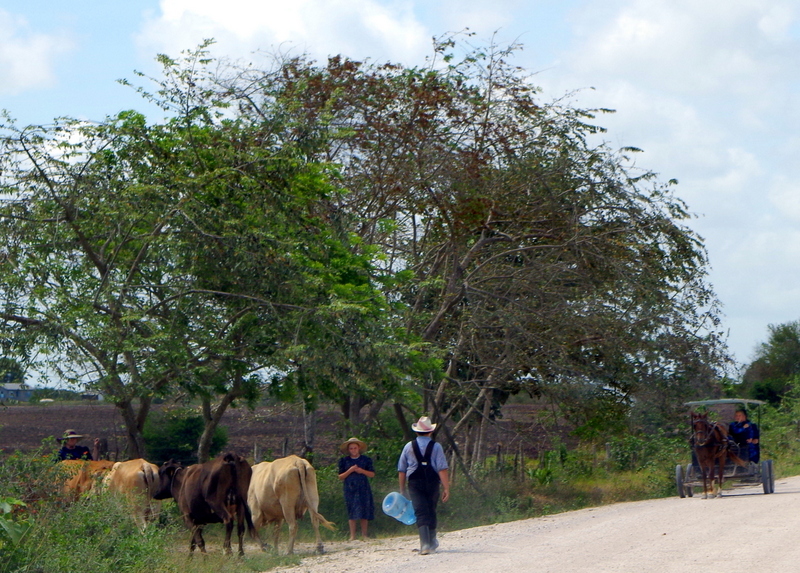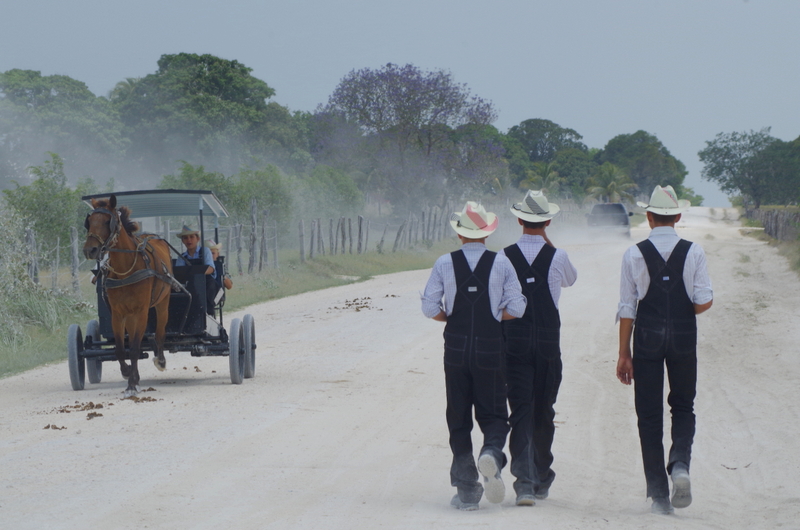 The drive out was long, the road mostly unpaved and dusty, we came through an area called New Belize and saw some Mennonites in their horse-drawn carriages and working the fields. You can’t miss them, they have their own distinct fashion: The men always wear black pants with suspenders, light-colored dress shirts and a straw hat. The women were longish dark dresses and either dark scarves or white scarves or straw hats with matching ribbons. Like the world stood still 150 years ago.