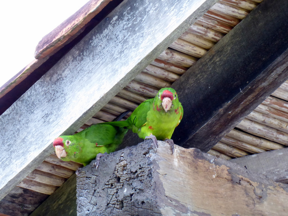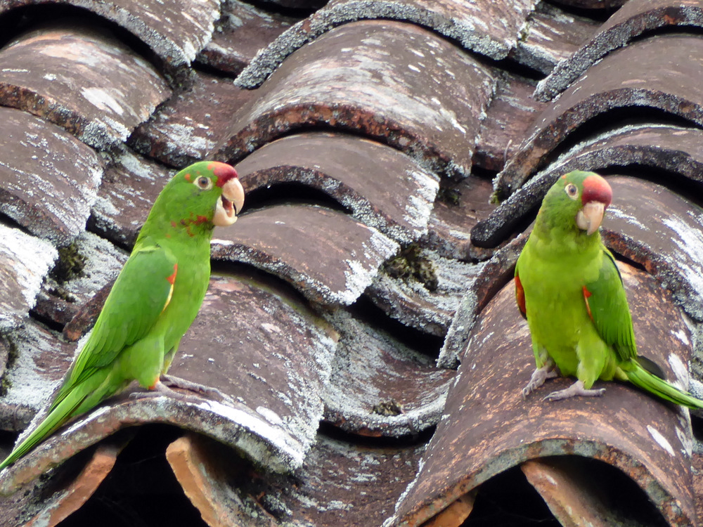 There are resident Chrimson-fronted parakeets that nest in the church tower, they were funny and playful and we spent a lot of time watching their antics.