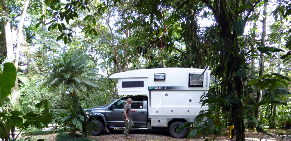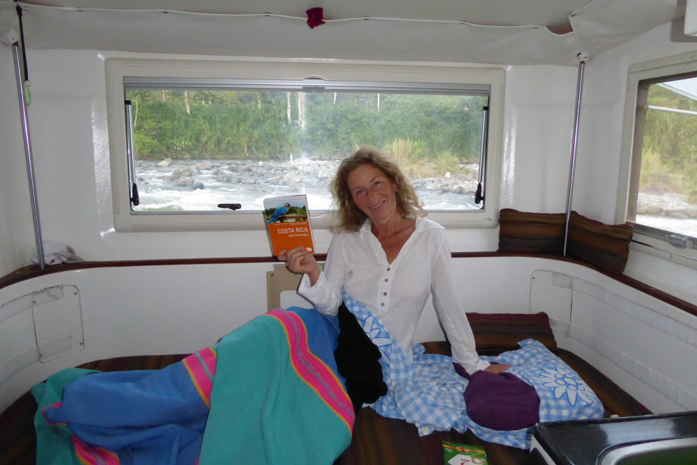 After a short visit to the Tapanti Park where we bought some vegetables from a local farmer and some wild mountain raspberries from a boy, we went to a restaurant/trout farm in Palomo on the banks of the Rio Grande the Orosi. A great spot to camp, the owner did not charge us anything and told us to enjoy. It was our first night with a visitor in our camper. The XP has ample room for one more adult, all we have to do is drop the table and there is an extra bed.