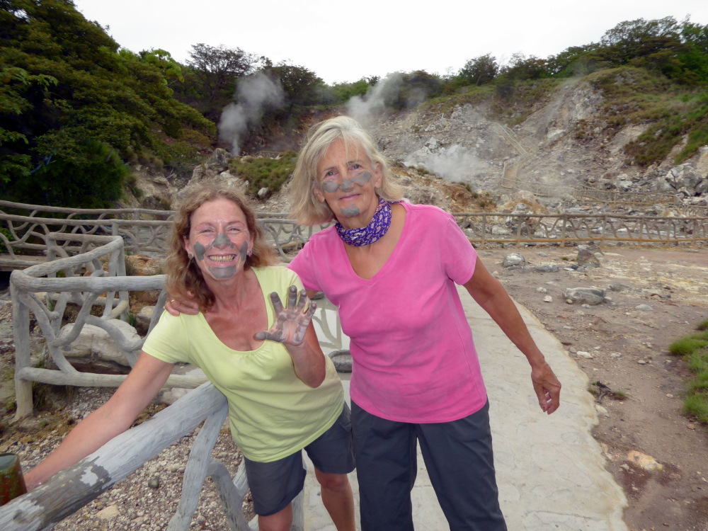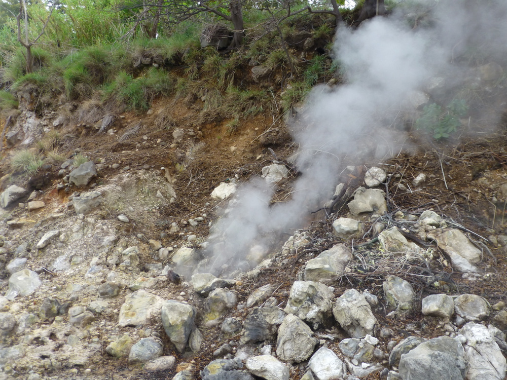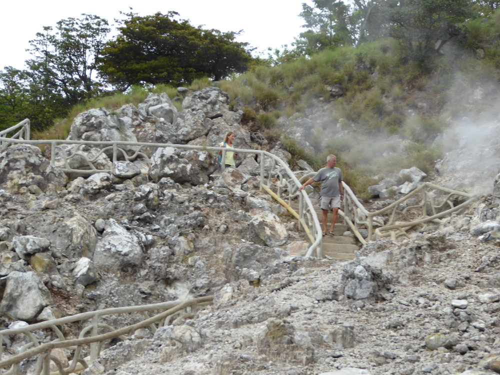 There is a geothermal power plant on its flanks , one can drive up past that plant to a place where the hot sulphur mud bubbles out of the ground. Las Hornillas charges you to walk around the place and if you want you can take a mud bath.