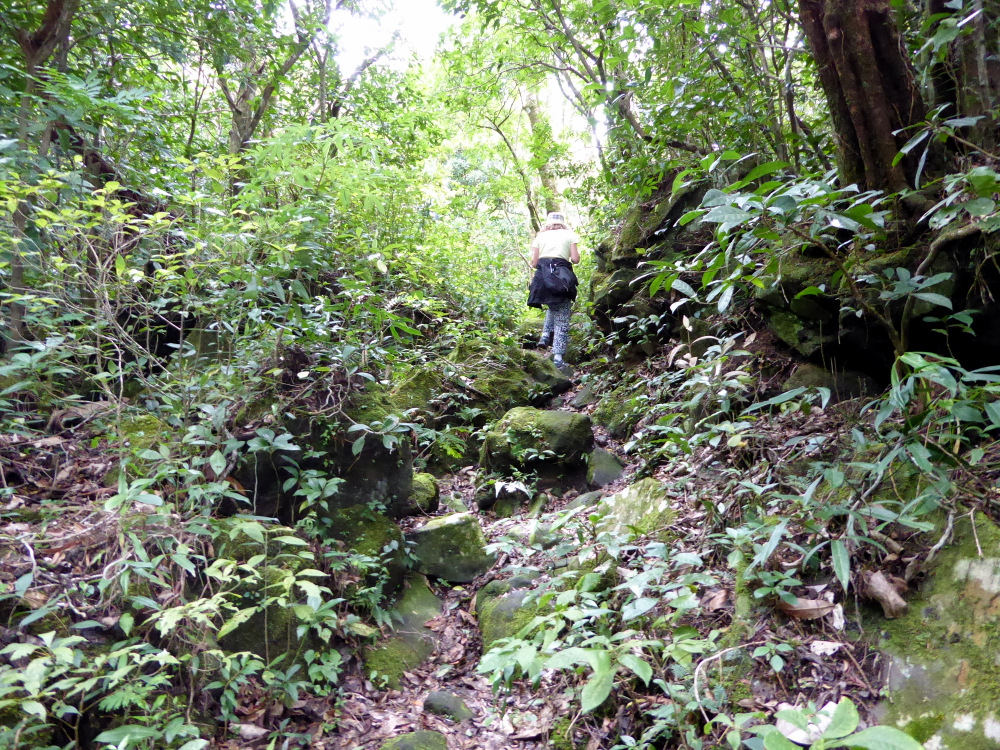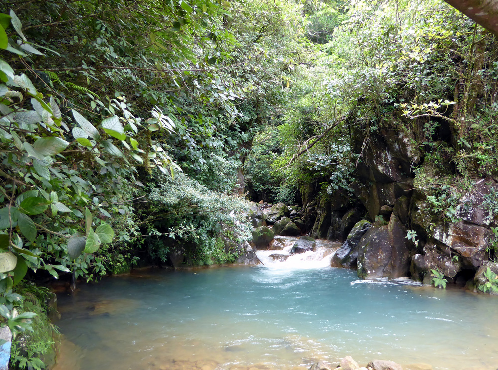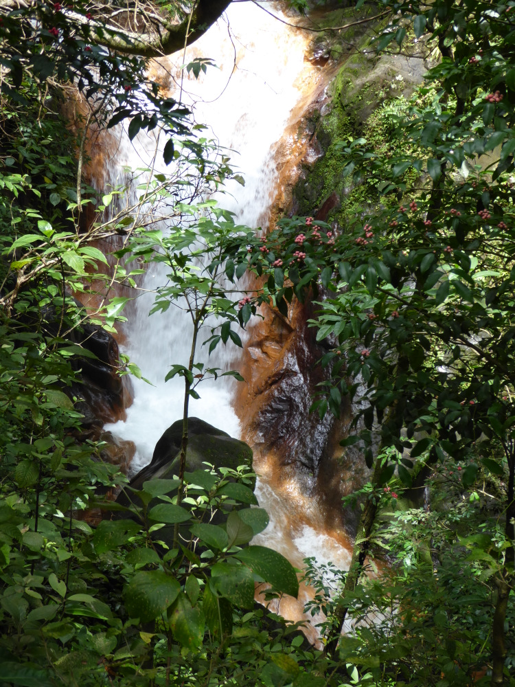 We drove farther up until the road actually terminated on top of a waterfall. There was a trail, not well maintained but flagged, so we followed it and hiked up into the jungle. It was a beautiful hike along a stream with lots of blooming jungle plants. We turned around when we lost the trail and could not find any flags anymore. That night we spent at a hot spring with a pool not far from there, sat in the hot water after sunset, watched the glow worms in the trees and the starry sky.