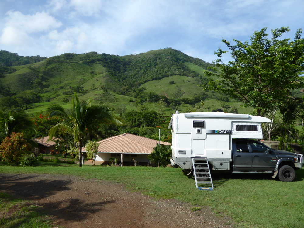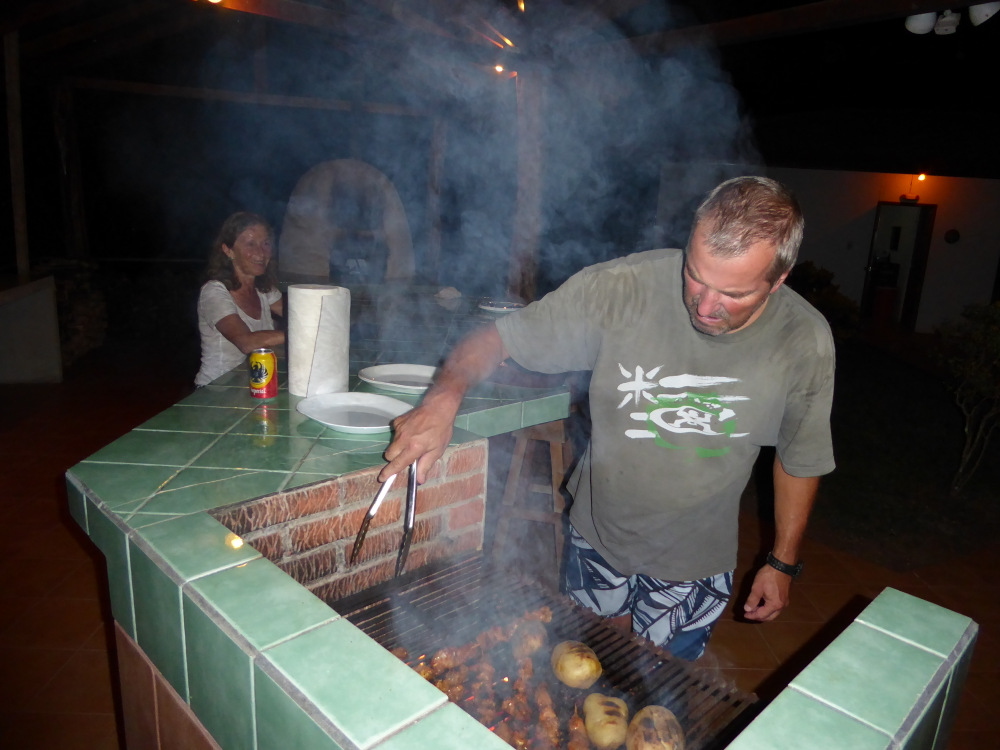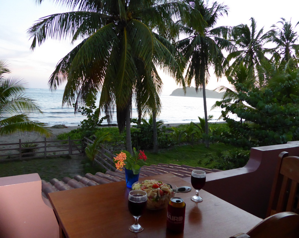 There are several places to “wild” camp right on the beach there, we picked one (Playa Grande) and had a miserable night with two fans blowing very warm air at us. The beach was beautiful, but after a long pre-sunrise walk we dreaded the heat and another sweaty night so we left for Samara. We had rented a beach house there, wanted to just lay back and regroup. But we were a day early and the house not ready. We contacted the owner and he was great, invited us to stay at his home up in the mountains behind the coast, in Nosarita Valley. As we followed him in his truck we had no idea where we would end up but he seemed like a great guy (and he was!). His place is a beautiful estate, there are fruit trees, a horse barn, a green house/growing area and he put us up in his guest house. Then he took us up into the mountains where he has a coffee finca. I want to rent that place some day, the spot is very special. Back down in the valley he invited us for dinner and grilled skewers of meat and made REAL pommes frites. What a guy! Brett, if you ever come to Alaska, we will take you out on the boat and cook you a fish!