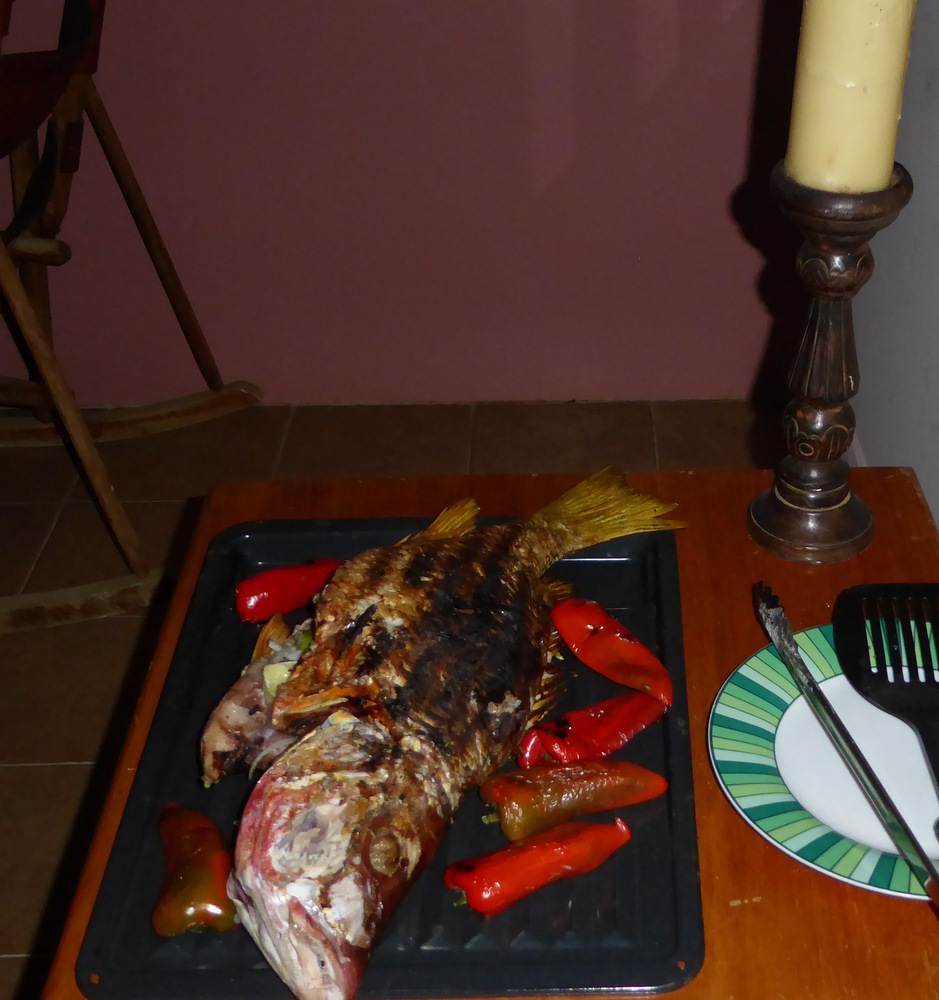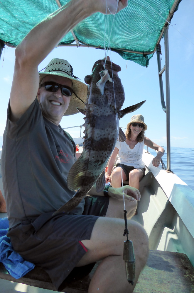 The house was perfect for us, right on the beach, two levels, Anita got the upstairs, each level has a full kitchen, bedroom and bath/shower. It had A/C and we were glad. We went for morning beach walks, swam and body surfed, read and ate a lot of fish. That is because we went out fishing with one of the fishermen and ended up with a hole bunch of huachenango (red snapper) und corvina (sea bass).