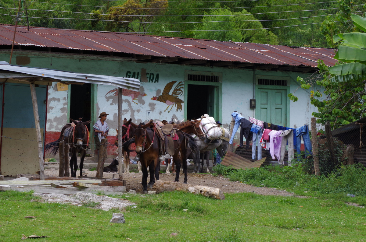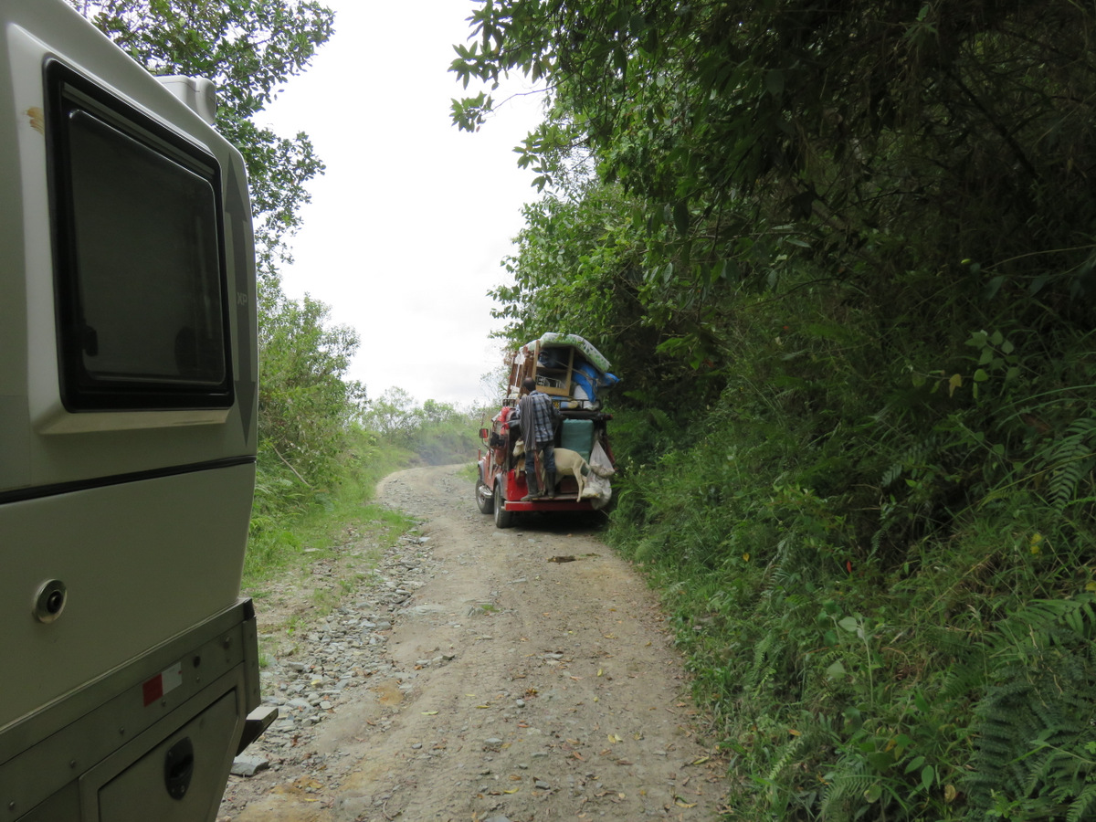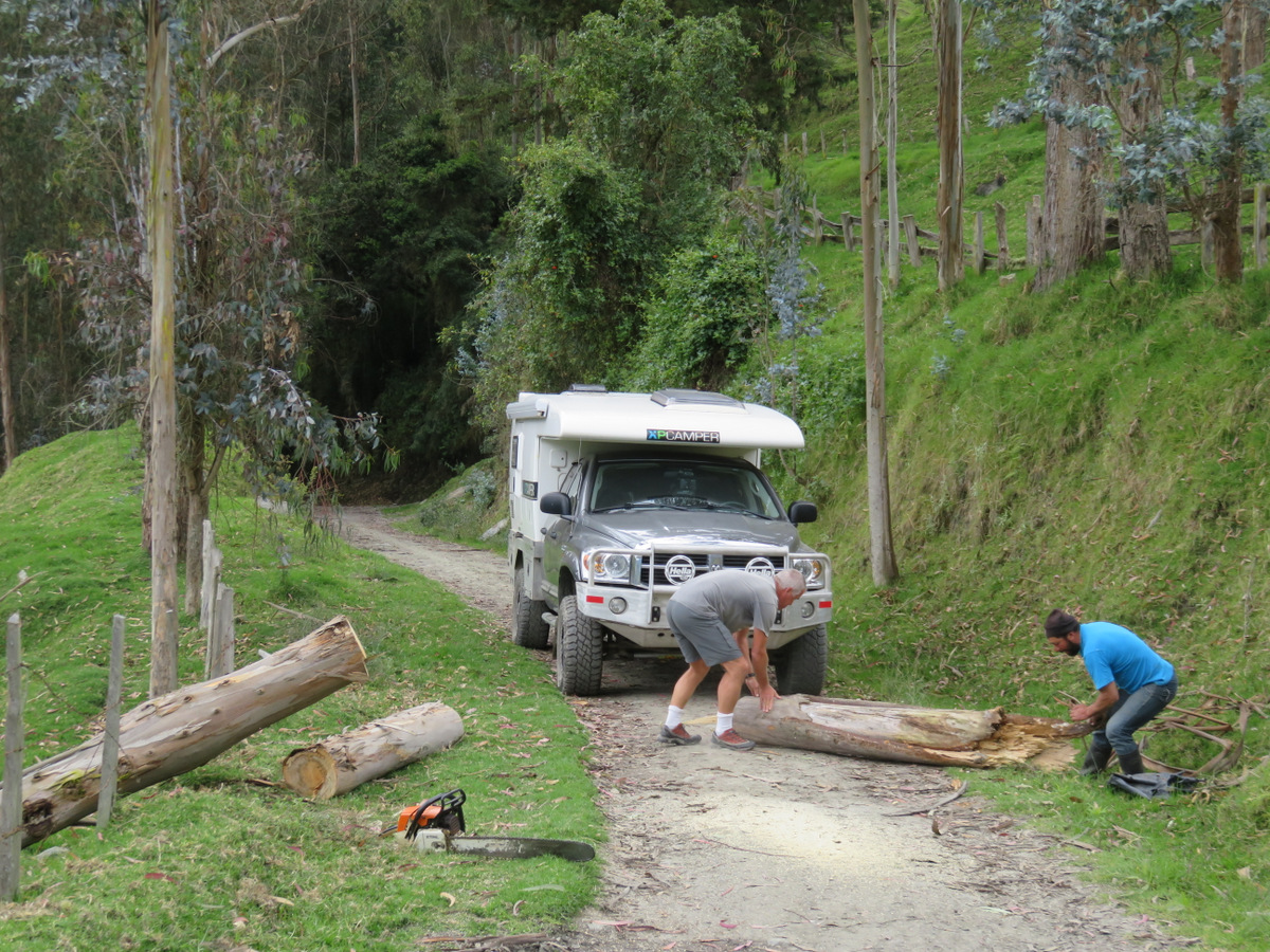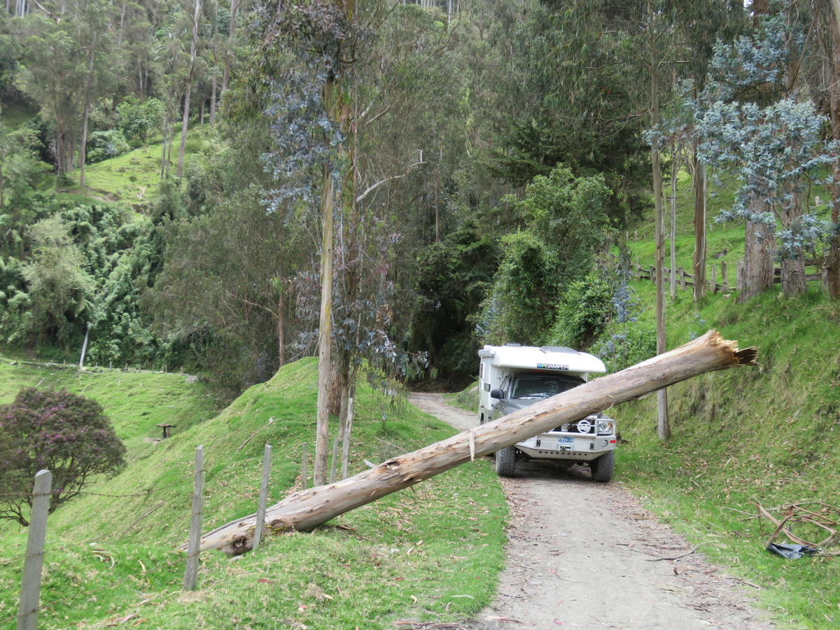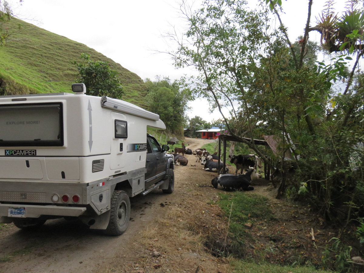 In town we talked to the owner of a bicycle rental and he pointed out a road on a map that goes over the mountains to Ibarra. He said there are many more wax palms on that route. We wanted to see that, so we took off and headed out of Salento up into the mountains again. It was a beautiful drive, single track dirt road (4×4 not needed) and winds its way over passes and through valleys. In Toche we took a left and continued up again. When it got late in the day we camped beside the road under the peak of Cerro Machin Volcano, near a hot spring. There was no traffic at all other than people on horseback or on foot. And the wax palms were everywhere, whole forests, we came to realize that they actually grow in/as a forest and what we had seen in the Valley de Cocora were sad remnants of a forest that had been cleared for cattle farming.